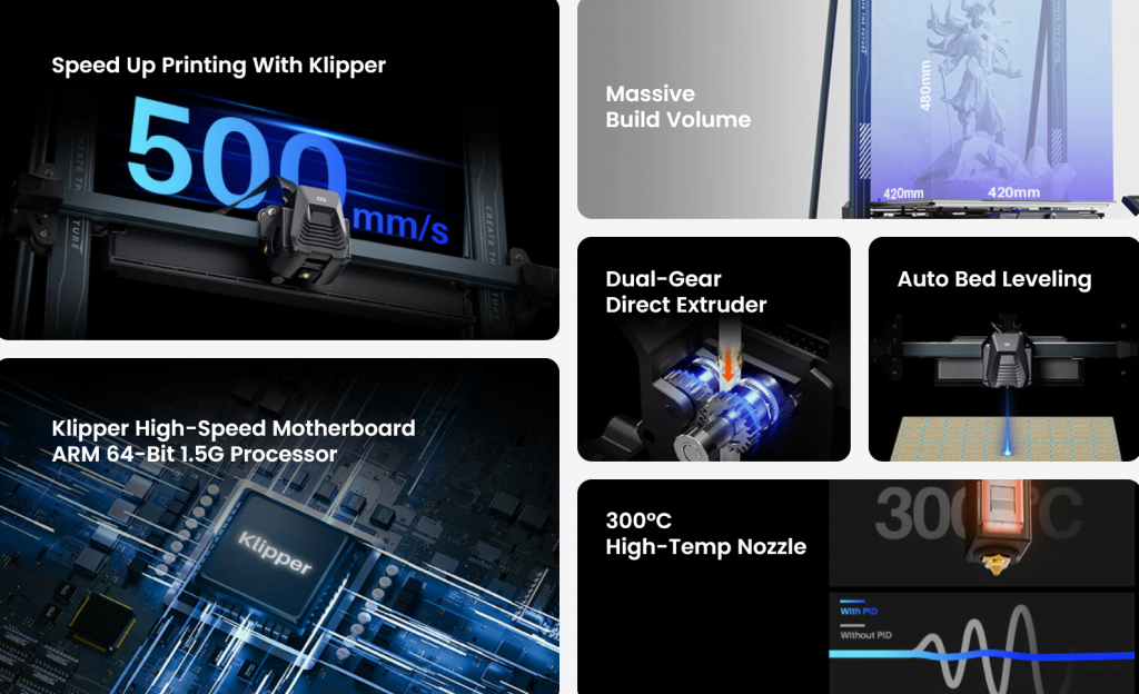 - Un espacio masivo para tus creaciones: La Neptune 4 Max cuenta con un volumen de impresión de 420 x 420 x 480 mm³, perfecto para crear modelos ambiciosos, ya sean modelos gigantes como gran cantidad de modelos pequeños.